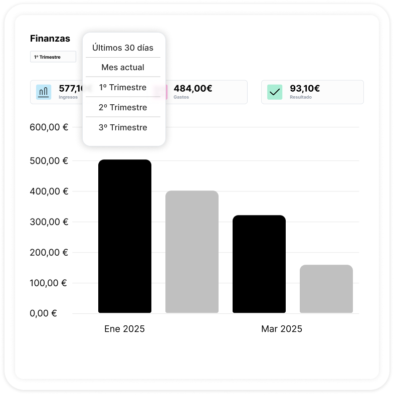 Sin tener que preguntar a nadie. Consulta en cualquier momento lo que has facturado, desglosado por trimestres, meses o fechas personalizadas.