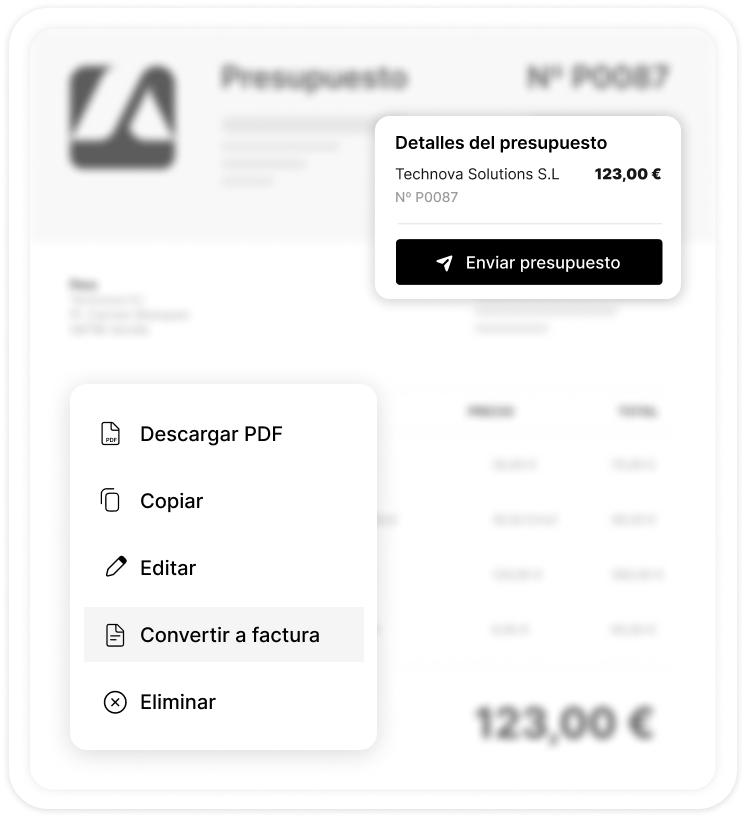 Envía presupuestos profesionales en segundos. Claros, profesionales y listos para convertir en factura con un solo clic, sin duplicar trabajo ni perder tiempo.